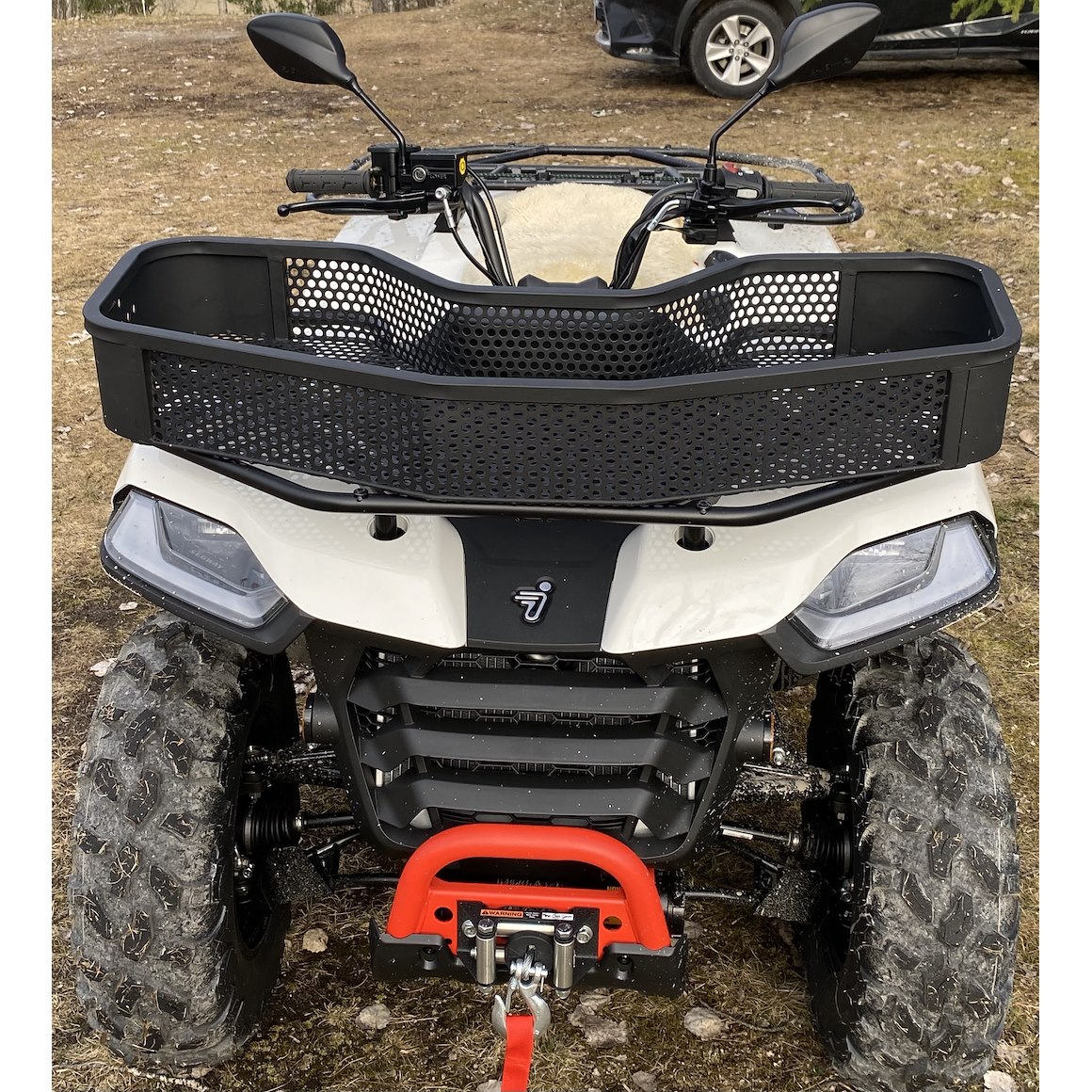 Praktisk frontkurv som passer alle firehjulinger. Laget av pulverlakkert stål med sider og bunn av grovmasket metallplate som lar vann og skitt renne igjennom i stedet for å samle seg i bunnen. Holder verktøyene og arbeidshansken dine rene og tørre.