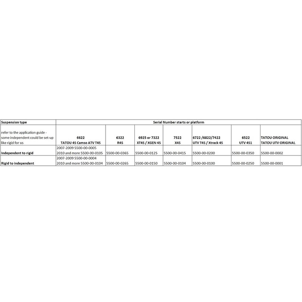Dette bakre settet konverterer fra stiv til delt fjæring og er kompatibelt med ATV T4S-beltesystemer fra 2010 og fremover, samt alle X4S-beltesystemer.