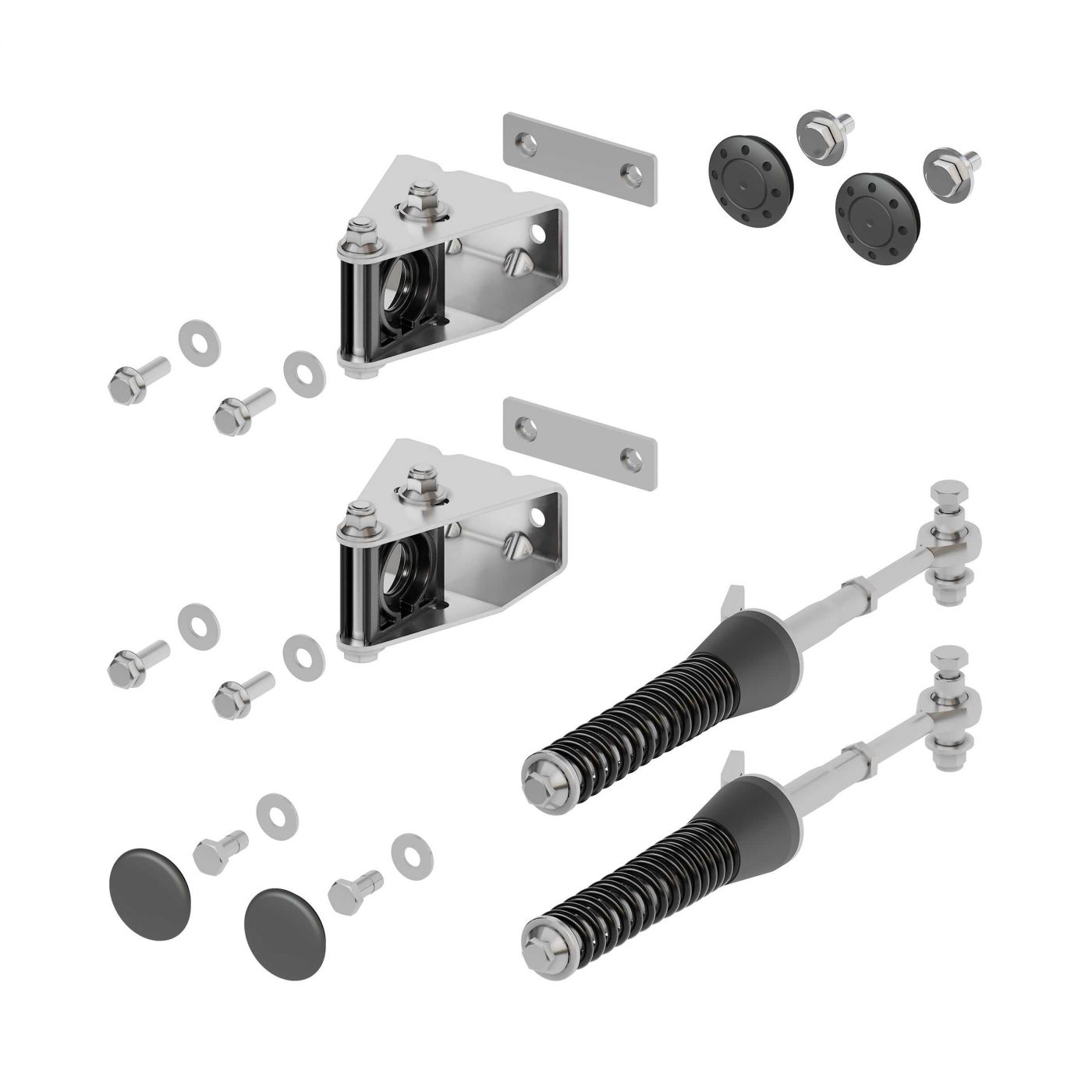 Inneholder 2 fester, 2 stabiliseringsstenger, 2 plater, 4 hjulnav, 8 bolter og 6 skiver for en komplett installasjon.