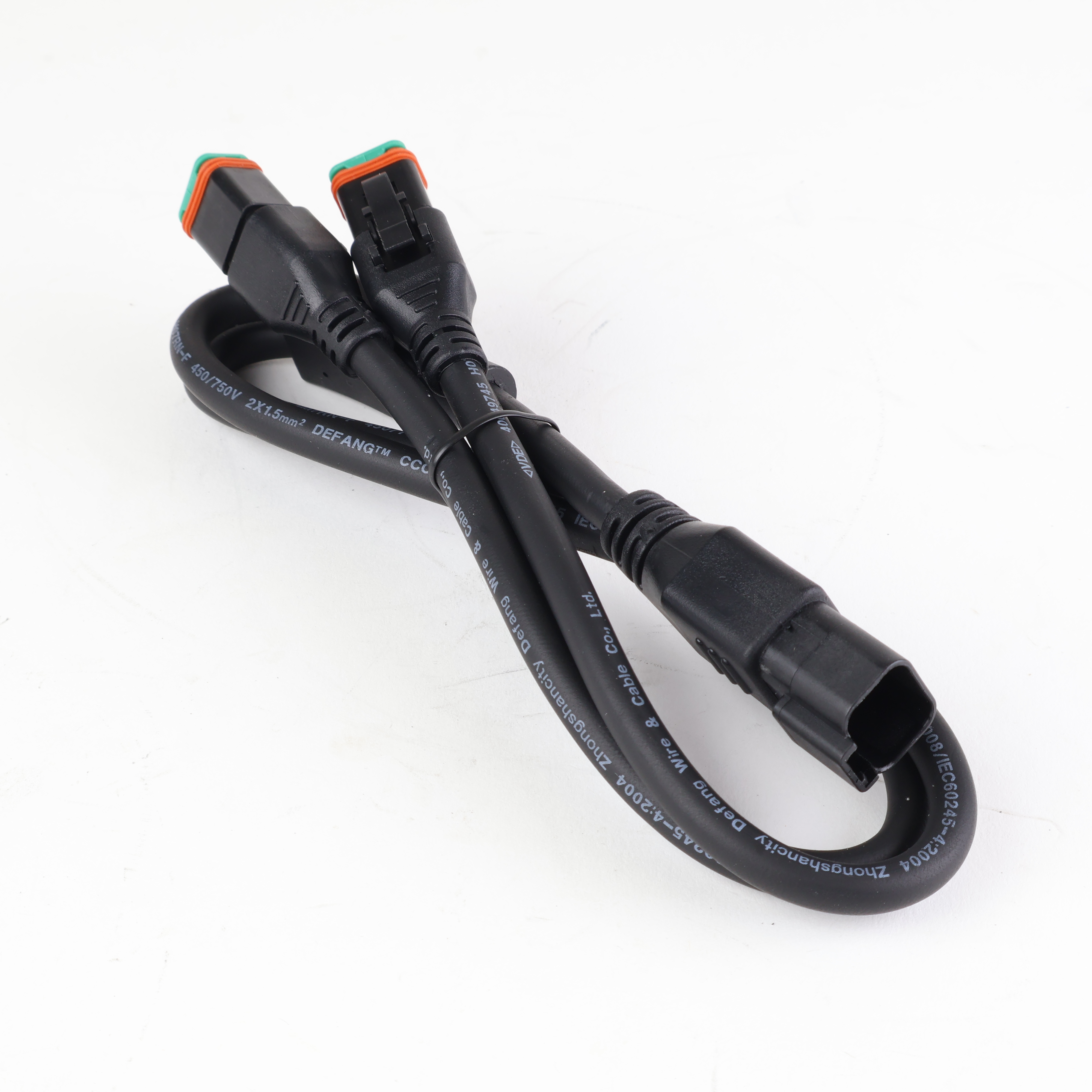 Praktisk og slitesterk fordelingskabel med en montert Deutsch (DT) hannkontakt som deles opp til to monterte Deutsch (DT) hunnkontakter. Perfekt når du vil koble to LED-lamper til et kabelsett med singelkontakt.
