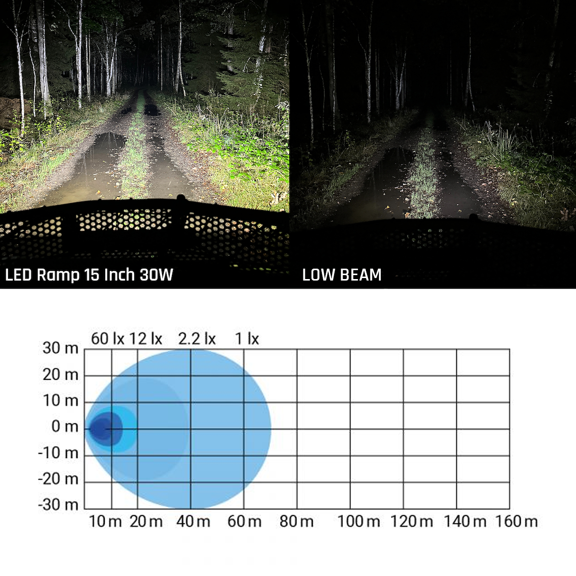 Flood-lyset sørger for at området nærmest rundt deg blir godt opplyst, mens spot-lyset gjør at du ser lenger frem og kan oppdage eventuelle hindringer i god tid.