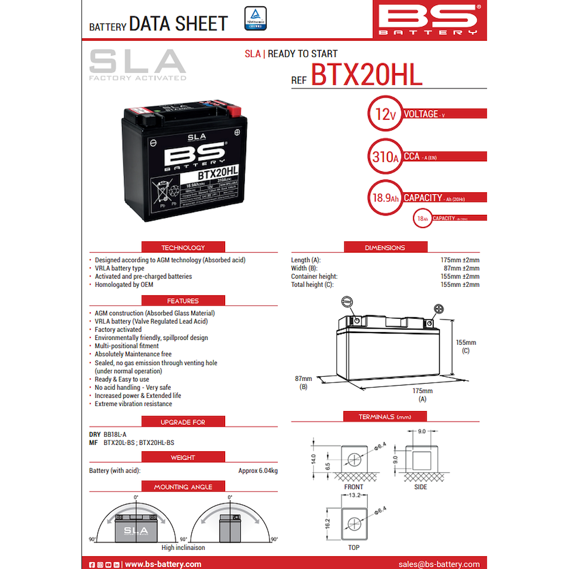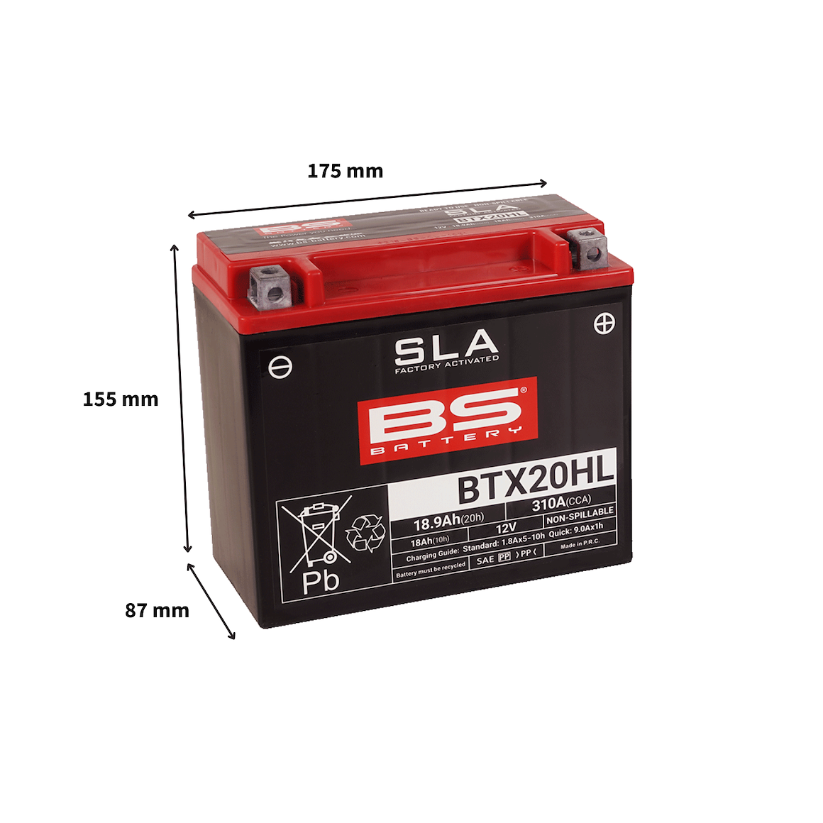 Passer firehjulinger og UTV hvor det er foreskrevet batteri av typen YTX20HL, også betegnelser som GTX20HL, MBX20HL osv. kan forekomme, se nedenfor for mål. Se bilde for plassering av plusspol.
