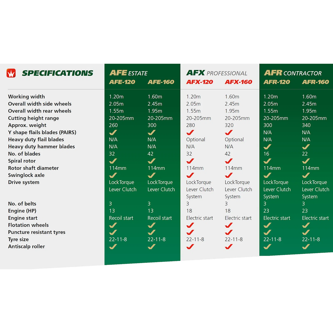 Wessex AFE-120 er en enklere versjon av den velkjente modellen AF-120, med en mindre motor på 13 hk fra Briggs & Stratton sammenlignet med den større 18 hk-motoren på AF-120. AFE-120 skiller seg også ut med sitt sentrifugalkoblingssystem som automatisk aktiverer klippevalsen ved full gass, i motsetning til øvrige modeller i Wessex AF-serien som krever manuell aktivering av reimen for å starte valsene.