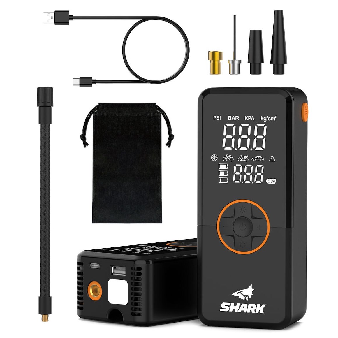 SHARK BP-150 har fire forhåndsinnstilte moduser for sykkel, motorsykkel, bil og ball, og slår seg automatisk av når ønsket trykk er nådd. LED-lyset har tre funksjoner – fast lys, SOS og blinkende – perfekt for bruk i mørket eller nødsituasjoner.