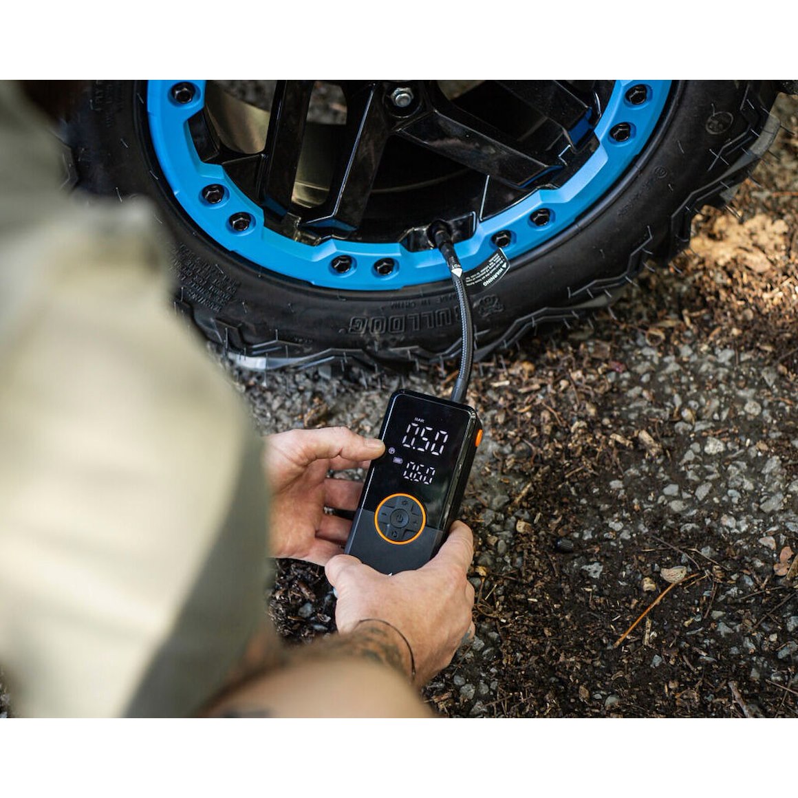 Den har to strømkilder – bruk den trådløst via det innebygde batteriet eller koble den til 12V-uttaket i bilen med den medfølgende kabelen. Det tydelige displayet viser både innstilt og aktuelt trykk med en nøyaktighet på ±1 PSI. Du kan enkelt bytte mellom PSI, BAR, KPA og kg/cm².