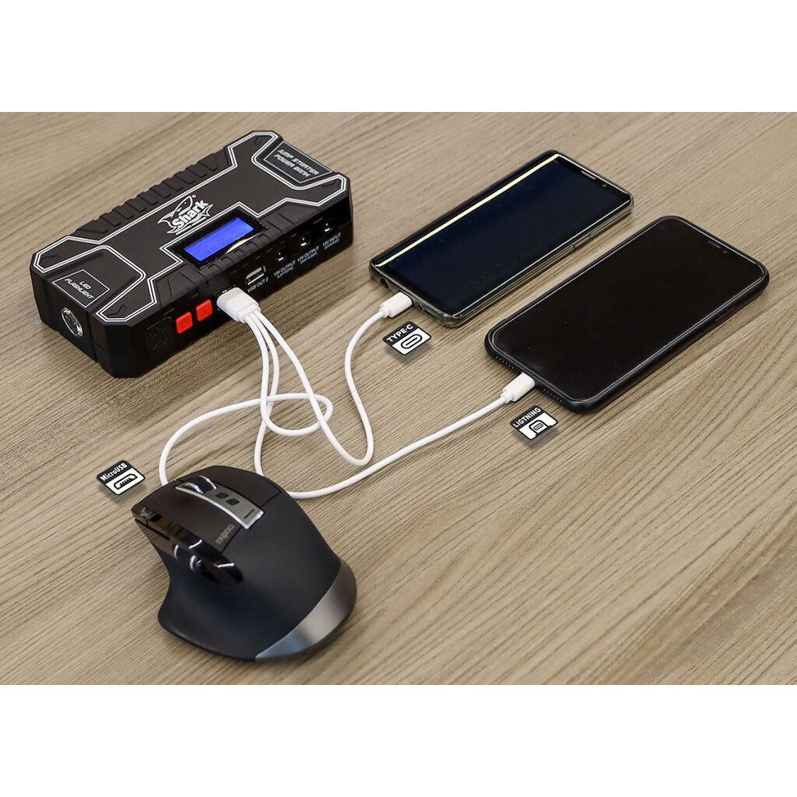 SHARK EPS-400 er en kraftig og kompakt starthjelp og powerbank i ett. Den kan starte kjøretøy med opptil 4,0 liters bensinmotor og gir opptil 30 starter på én full lading. Perfekt for ATV, MC, bil eller båt – en trygg løsning når batteriet svikter.
