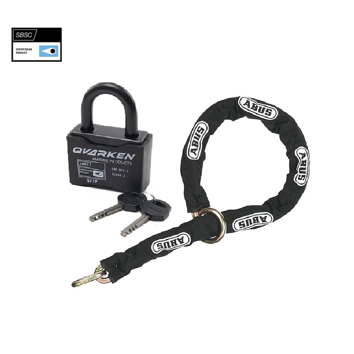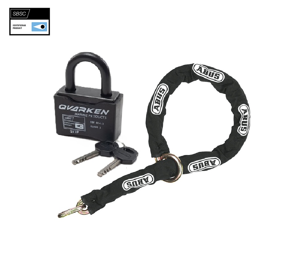 Denne ATV-låspakken inkluderer en 2,5 meter klasse 3 godkjent kjetting og en like klasse 3 godkjent hengelås, som er optimal for å immobilisere kjøretøyet. Kjettingen er lang nok til å låses gjennom både felg og rammedel eller til å feste kjøretøyet til en fast gjenstand eller gjennom en låsesløyfe.